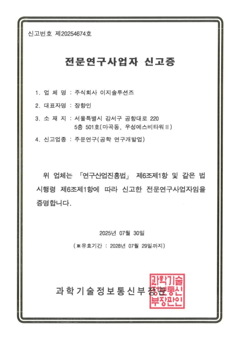 2025년 7월 30일 수요일 (주)이지솔루션즈는 「연구산업진흥법」제6조제1항 및 같은 법 시행령 제6조제1항에 따라 전문연구사업자로 신고 완료하였습니다.