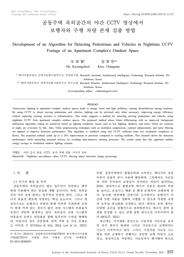 [논문] 공동주택 옥외공간의 야간 CCTV 영상에서 보행자와 주행 차량 존재 검출 방법